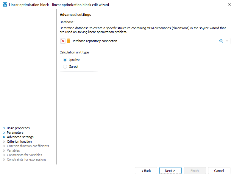In the Database drop-down list select the database that will be used by linear optimization block. If a database is set in the repository used by default, it is selected automatically.