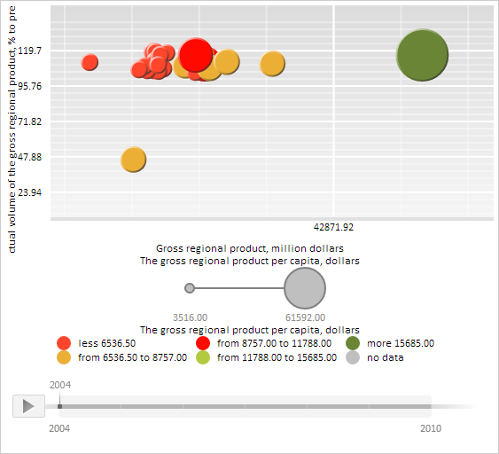 // Get settings for mapping coordinates by the X axis for bubble chart items var xDataMapping = bubbleChart.getMapping(PP.Ui.VisualType.X); var yDataMapping = bubbleChart.getMapping(PP.Ui.VisualType.Y); // Set minimum and maximum values for the X axis of bubble chart var xDataTransformer = xDataMapping.getDataTransformer(); xDataTransformer.setMinValue(-10000); xDataTransformer.setMaxValue(70000); // Set minimum and maximum values for the Y axis of bubble chart var yDataTransformer = yDataMapping.getDataTransformer(); yDataTransformer.setMinValue(25); yDataTransformer.setMaxValue(130); // Refresh bubble chart bubbleChart.refresh();