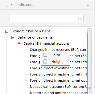 property_image.gif IndicatorElements The IndicatorElements property sets the list of indicators that determine the method of displaying data in the working area of the express report. These indicators are shown in the menu when the user selects a dimension on the Indicators tab of the properties panel.