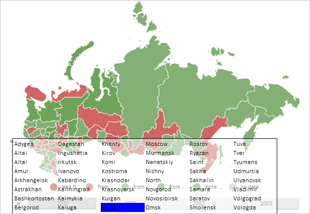 To execute the example the HTML page must contain the MapChart component named map (see Example of Creating the MapChart Component). Show map layer territories info and select an item that corresponds to the area with the RU-KRS identifier: