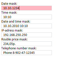 After executing the example the HTML page contains editors with templates for entering date, time, date and time, IP address, ruble price, and phone numbers. Editor values are defined. An indicator of incorrect input signals if the user attempts to type in a value that does not correspond to a regular expression:
