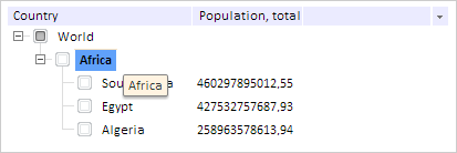 Hover mouse cursor over the element with the Africa contents, as a result node color is blue and text is bold: