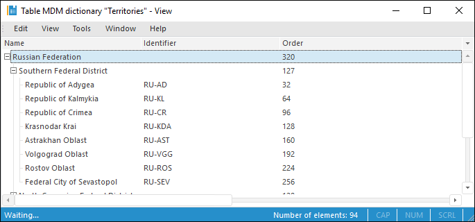 | LEVELATTR | String | It sets the attribute, which determines view type of level names in the drop-down list. A specific attribute can be set for each dictionary level. The value for this parameter is determined by the following string: 0{X1*Y1,X2*Y2,...,Xn*Yn}, where: X1-Xn is the dictionary level key, for which displayed attribute should be selected; Y1-Yn is the dictionary attribute key, which values will be displayed as element names for the specified level. | None |