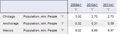 This table contains the city dimension in rows, the calendar dimension in columns, and the factor dimension is fixed.