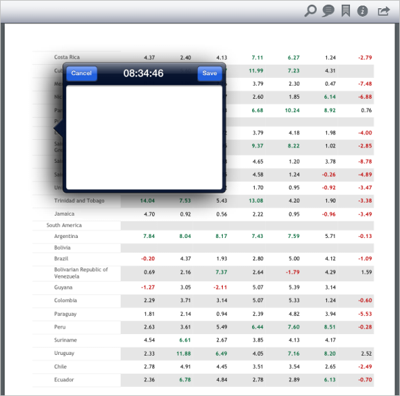 MAProceduralReportDataViewController<MADataViewControllerProtocol> *contr = (MAProceduralReportDataViewController<MADataViewControllerProtocol> *)[(MAProceduralReportViewController *)m_controller activeDataViewController]; // Create a new note Note *note = [Note new]; [note initWithText:@"New" offset:CGPointMake(10, 20)]; [note setText:[NSString stringWithFormat:@"%@ note", [note text]]]; [note setOffset: CGPointMake([note offset].x * 10, [note offset].y * 10)]; [note setPage:[contr pagesCount] - 1]; // Specify the time 12:33:05 as current NSDateComponents *comps = [NSDateComponents new]; [comps setHour:12]; [comps setMinute:33]; [comps setSecond:5]; NSCalendar *gregorian = [NSCalendar currentCalendar]; NSDate *date = [gregorian dateFromComponents:comps]; // Set time of last note change [note setTimestamp:[date timeIntervalSince1970]]; // Determine a dialog for creating and editing of note AddNoteDialog *noteDialog = [[AddNoteDialog alloc] init]; [noteDialog setDelegate:contr]; // Delegate [noteDialog setPoint:[note offset]]; // Note location [noteDialog setTimestamp:[note timestamp]]; // Note creation time [noteDialog setText:[note text]]; // Note text [noteDialog setMode: kNoteDialogNewNote]; // Edit note [noteDialog setNoteIndex:1]; // Note index in array of all notes // Refresh dialog [noteDialog refresh]; // Set contents size in popup window [noteDialog setContentSizeForViewInPopover:CGSizeMake(300.0, 200.0)]; // Create a popup window UINavigationController *navController = [[[UINavigationController alloc] initWithRootViewController:noteDialog] autorelease]; UIPopoverController *popoverController = [[UIPopoverController alloc] initWithContentViewController:navController]; popoverController.delegate = contr; // Change current page of regular report [contr jumpToPage:[note page]]; // Determine popup window contents CGPoint offset; // Determine popup window margins offset.x = note.offset.x * [contr pdfView].scrollView.zoomScale; float pageOffset = [note page]*[contr pdfView].scrollView.contentSize.height / [contr pagesCount]; offset.y = (note.offset.y + pageOffset)* [contr pdfView].scrollView.zoomScale; // Display popup window [popoverController presentPopoverFromRect:CGRectMake(offset.x, offset.y, 1, 1) inView:[contr pdfView].scrollView permittedArrowDirections:UIPopoverArrowDirectionAny animated:YES];
