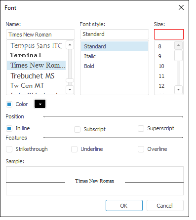 If the property is set to True, when the dialog box opens, the field of font size is empty. The property is set to False by default, the font size of the component is selected in the dialog box (The font size set in the Font property).