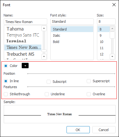 The ShowEffects property determines whether elements allowing setting up color, position, text strikethrough and underlining parameters are displayed.