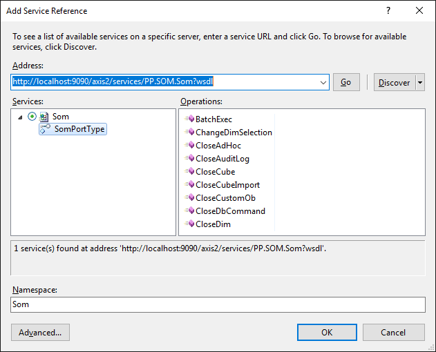 In the opened dialog box specify the URL of wsdl of installed BI server or security server (the specified example describes BI server connection). Address format is given in basic description of web service connection. In the Namespace field specify name of the namespace to be created for the project and to be used to access web service resources. After that click the Go button. If the connection is successful, the name of the available web service and the list of its operations are displayed. Click the OK button. The following objects are added to the project: the System Reference folder that contains a reference to the created namespace and the App.config file. Based on the wsdl file contents, the types to be used to write the code for working with the web service, will be created in the specified namespace.