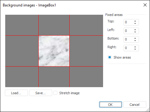 The Display Area checkbox controls displaying red lines separating fixed image area from zoomed areas. Fixed areas are displayed in the same way as in the source file. The rest of the image area is zoomed in accordance with sizes of the ImageBox component. The size of the fixed area is specified in pixels and depends on the sizes of the loaded image.