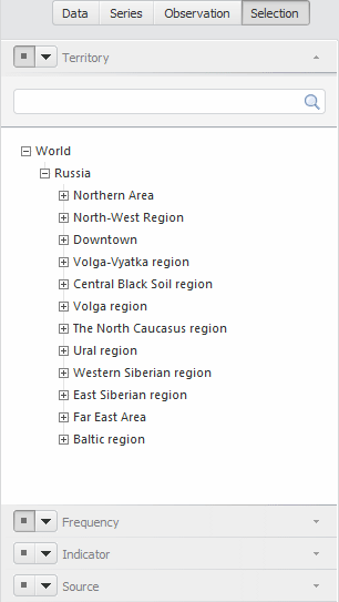 A series tree shows the tree structure of the open data source elements. The structure of the series tree is based on the chain of attributes defined in the breadcrumb. Levels of the hierarchy of the series tree are shown as folders, which names correspond to attribute values. Multiple elements can be selected in the series tree by holding down SHIFT or CTRL.