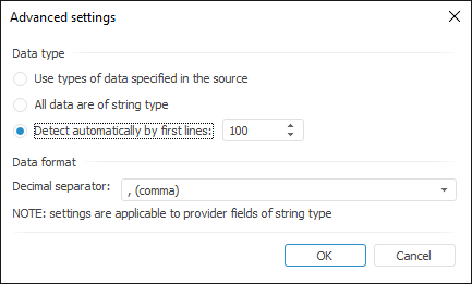 NOTE. Advanced settings of imported data type and format are available for all data sources, except for time series database.