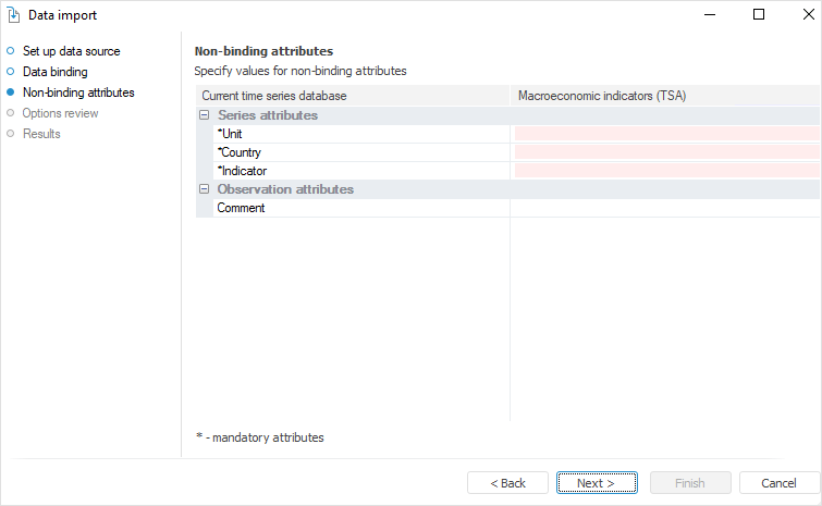 Time series attributes and observation attributes are divided into corresponding groups. Values of mandatory attributes marked with an asterisk must be filled.