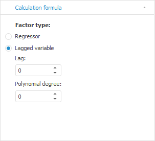 Lagged Variable. The factor is used as a lagged variable. Lagged variable is a variable, which values are considered in different moments of time, divided with some interval (lag). Set parameters of lagged variable:
