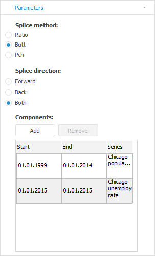 Components. The table contains series areas, participating in the splice. Start and end dates of the series splice are given in the corresponding columns.