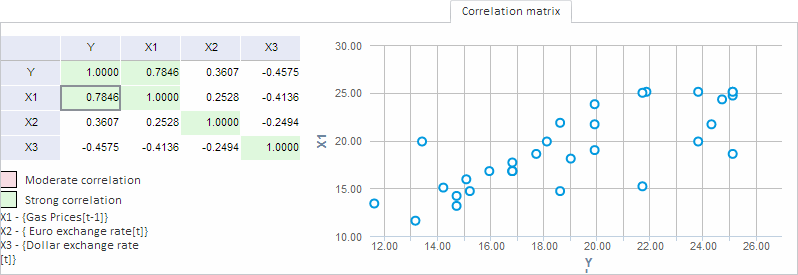 The Correlation Matrix tab shows values of correlation coefficients and a scatter chart of variable dependencies.
