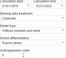 The test is executed consecutively for each selected variable. The ADF statistics is calculated and compared with the N percent (N = 1%, 5%, 10%) significance level. Based on this comparison, the conclusion is formed about stationarity or non-stationarity of the series. The results are displayed as a table, for example: