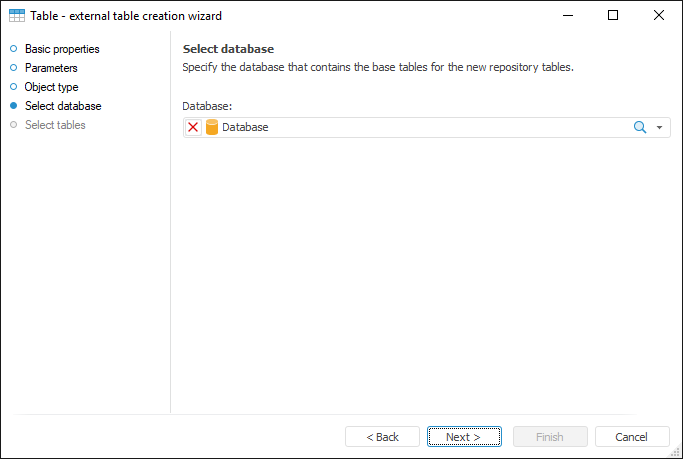 Use the Select Database page to specify the database that contains tables that should be used to create new external repository tables.