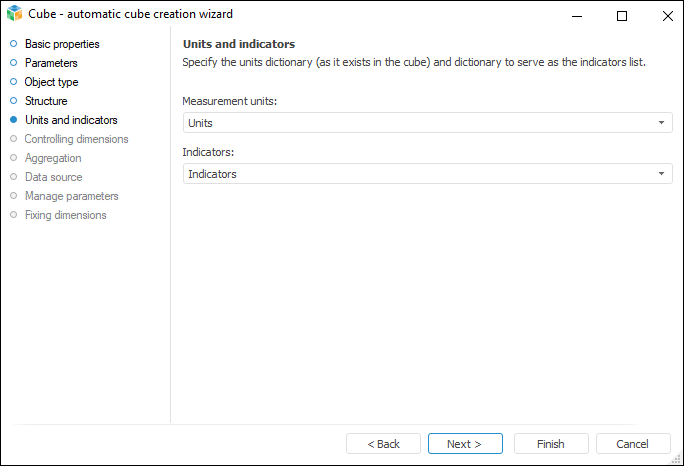 Select the dictionary in the drop-down lists that contain all existing cube dictionaries. These dictionaries must have a certain structure: Units and Indicators. If the structure of the selected indicators or units dictionary does not satisfy the required conditions, a warning message is displayed.