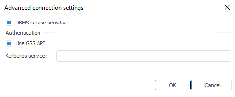 Kerberos Service. The Kerberos service is used together with GSS API. GSS API enables the use of various Kerberos implementations without modifying application code. The Kerberos service name, that is determined in PostgreSQL server settings, must be specified in the box. For details about Kerberos API see the product's official site.