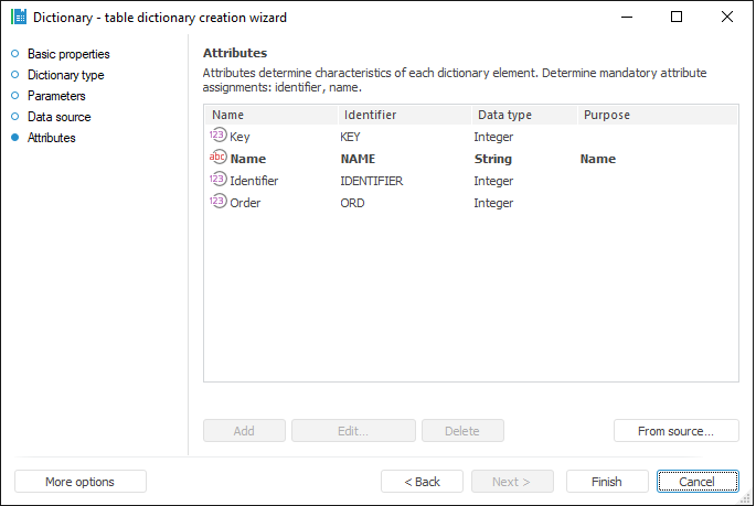 To form a list of attributes based on the list of source fields, click the From Source button. The button is available if the source structure, on which the dictionary is based, has been changed, and the dictionary structure is required to update.
