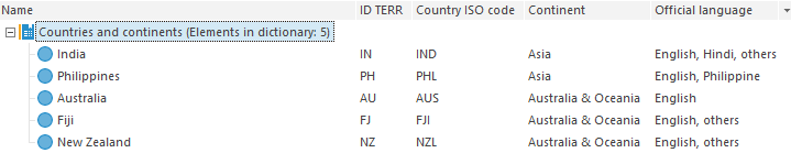 To do this, go to the dictionary elements tab, select the Asia and the Australia and Oceania elements in the Continent drop-down list, select the English element in the Official Language drop-down list: