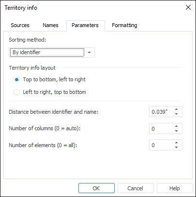 To set up territory info elements, use the Parameters tab in the Territory Info dialog box.