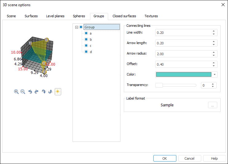 To set up group parameters, go to the Groups tab of the 3D Scene Options dialog box: