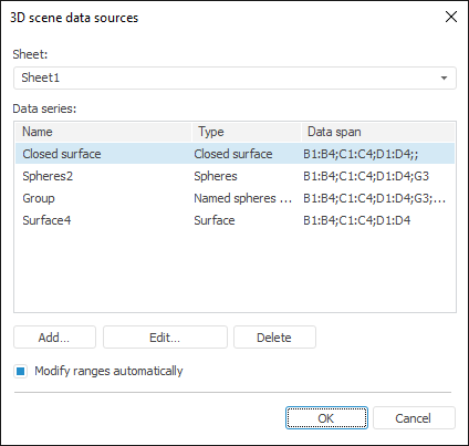 Each 3D scene object (surface or spheres) is a data series, for which a data source must be determined. Source rows contain series points (or vertices of a multidimensional shape), while columns contain coordinate values (X, Y, Z) and point radii.
