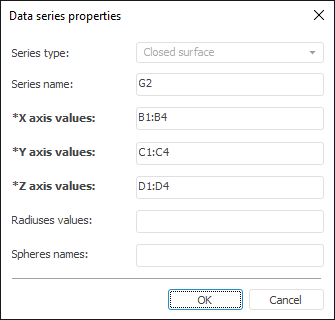 The Data Series Properties dialog box opens on adding or editing 3D scene data sources. Dialog box appearance depends on the selected series type.