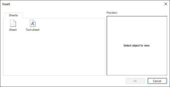 Select Text Sheet on the Sheets tab of the Insert window. A text sheet is added.
