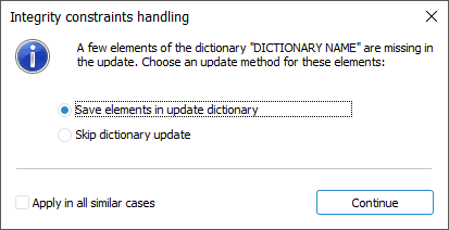 When a table or MDM dictionary is updated and the updated object contains elements or records that are missing in the update, a dialog box may open where the user should select the required option: