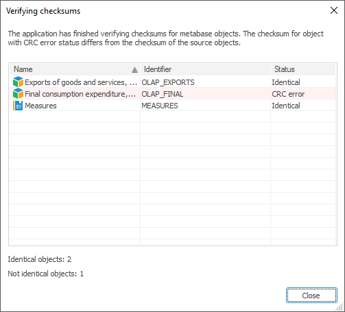 The dialog box displays a table with results of verifying the previous checksum with the current one. Identifiers, names and verification status are displayed for objects.