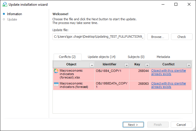 The Conflicts tab of the Information page displays different conflicts (except for the mandatory access control conflicts), which occur during the update check: