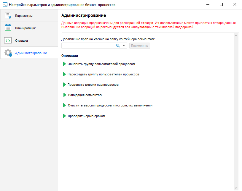 Важно. Данные операции предназначены для расширенной отладки. Их использование может привести к потере данных. Выполнение операций не рекомендуется без консультации с технической поддержкой.
