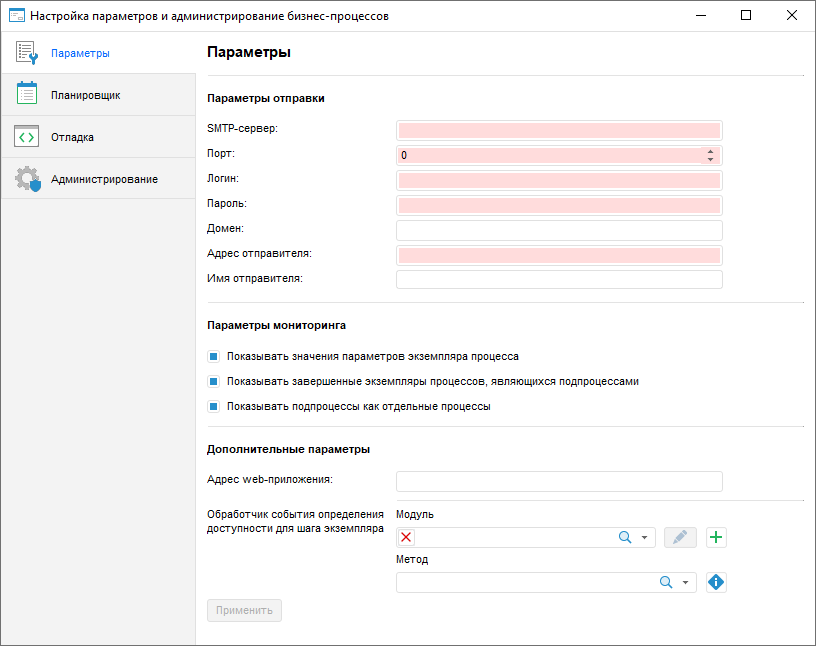 Настройка параметров процесса | Настройка параметров бизнес-процессов | Настройка планировщика бизнес-процессов | Настройка отладки бизнес-процессов | Администрирование бизнес-процессов