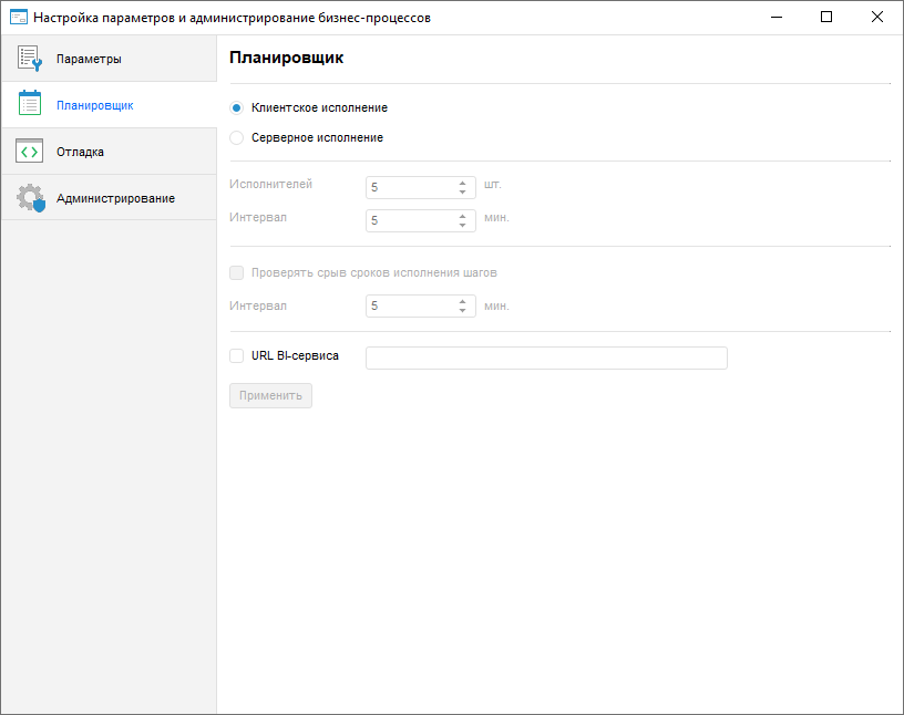 Настройка планировщика бизнес-процессов выполняется на странице «Планировщик» в окне «Настройка параметров и администрирование бизнес-процессов»:
