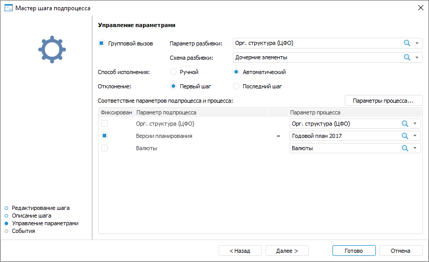 Для создания шага по запуску одного или нескольких вложенных подпроцессов с определенными параметрами откройте мастер шага подпроцесса.