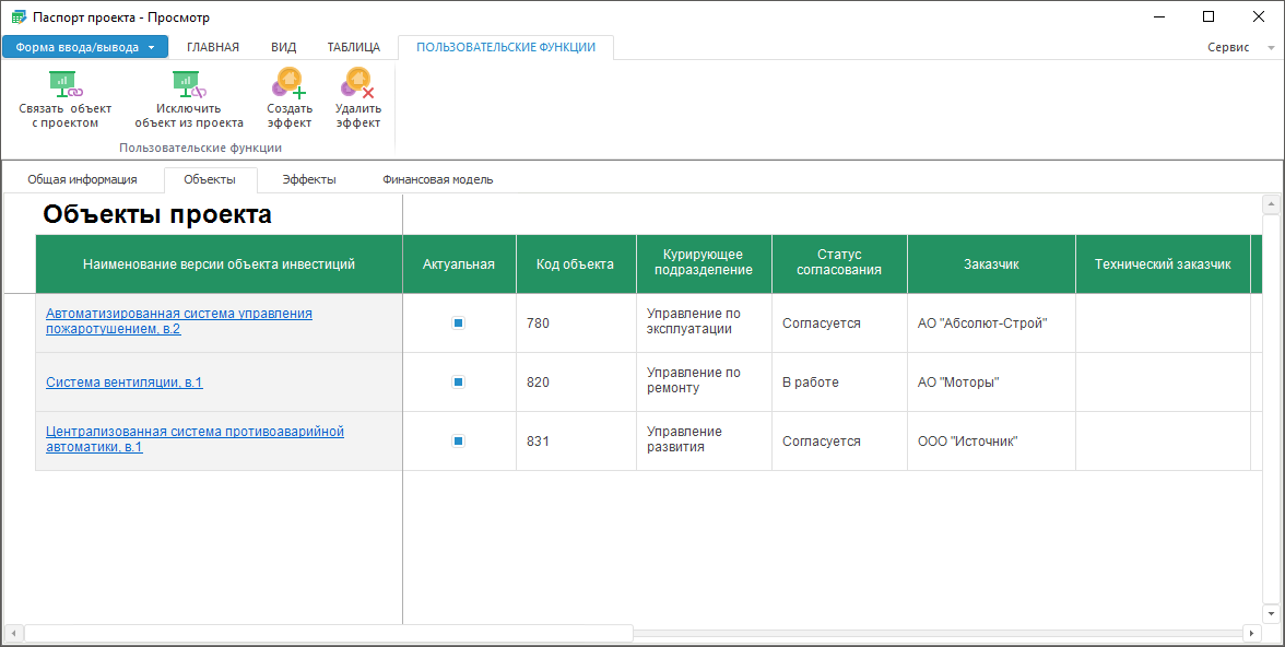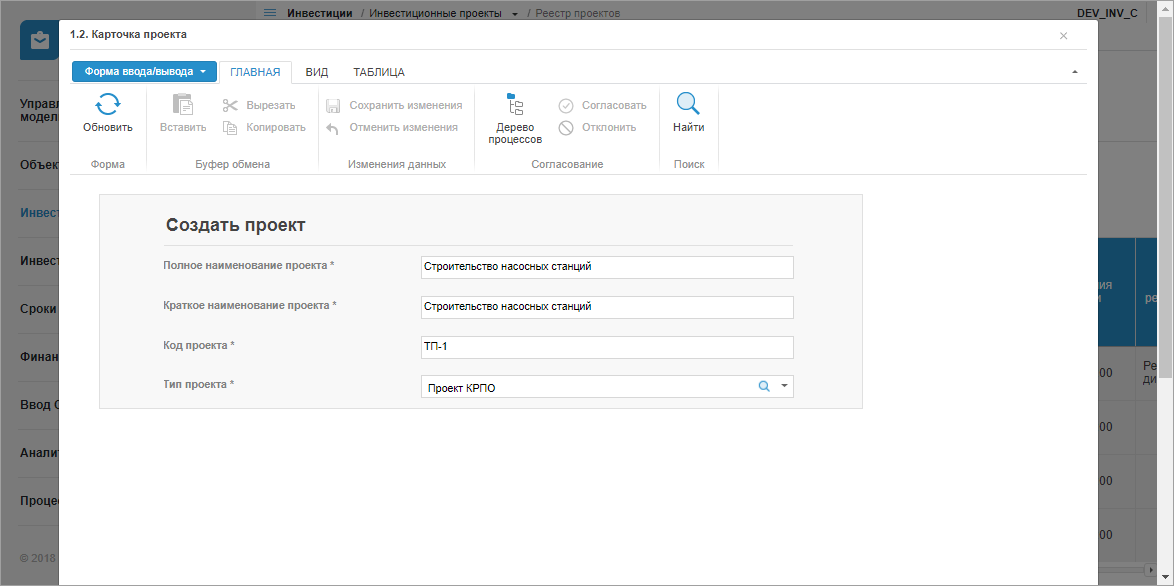 Реестр проектов представляет собой форму ввода, содержащую список всех инвестиционных проектов и их версий.