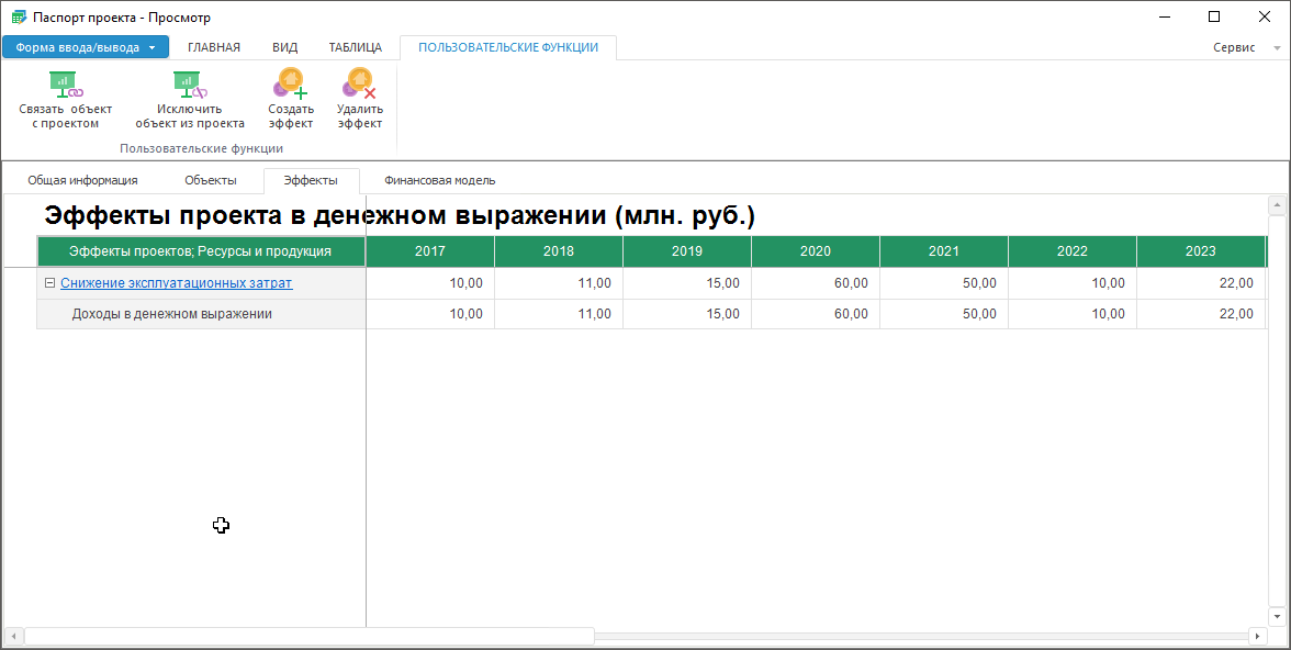 На листе «Эффекты» добавьте эффекты от реализации проекта в денежном выражении.