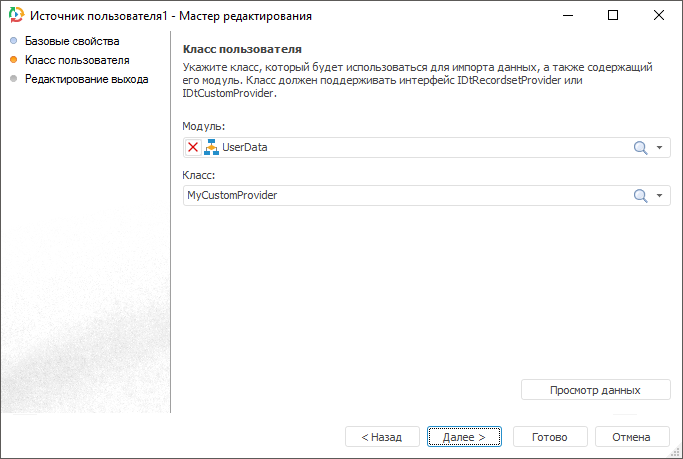 В раскрывающемся списке «Модуль» выберите модуль/форму/сборку/.NET-сборку, а в раскрывающемся списке «Класс» выберите класс, в котором содержится реализация пользовательского алгоритма извлечения данных. Класс должен быть унаследован и содержать реализацию интерфейса IDtRecordsetProvider или IDtCustomProvider.