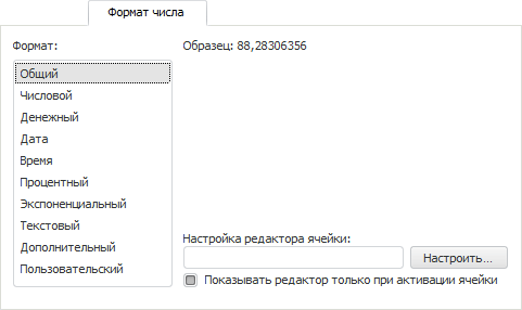 Вкладка содержит список предустановленных форматов отображения содержимого ячеек листа. Выберите формат данных и настройте его параметры. Вид вкладки и набор настроек зависит от используемого инструмента.