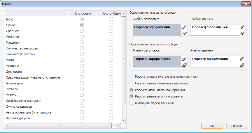 Для настройки дополнительных параметров итоговых значений используйте окно «Итоги».