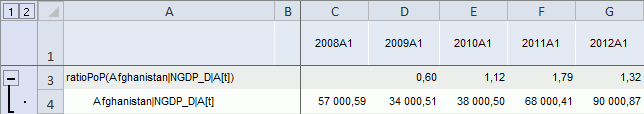 После применения функции в таблицу данных для каждого выделенного ряда будет добавлен ряд с наименованием вида «ratio<Период>(<Имя_Ряда>[t])(<Имя_Ряда>)», содержащий результаты расчета. Например: