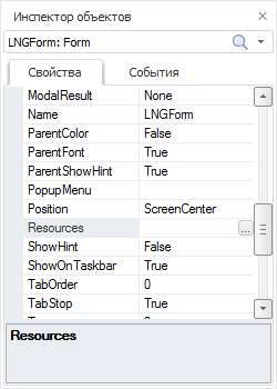 Укажите ранее созданные ресурсы «ResForAppl» и нажмите кнопку «ОК». После этого в инспекторе объектов у всех визуальных компонентов к свойствам, имеющим строковый тип данных, будет добавлен дополнительный атрибут «ResourcesID». Значение данного атрибута будет формироваться автоматически:
