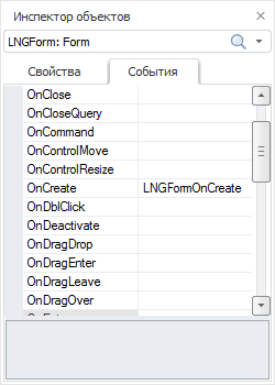 Дважды щелкните по ячейке, соответствующей событию OnCreate. Будет создан обработчик события с наименованием «LNGFormOnCreate».