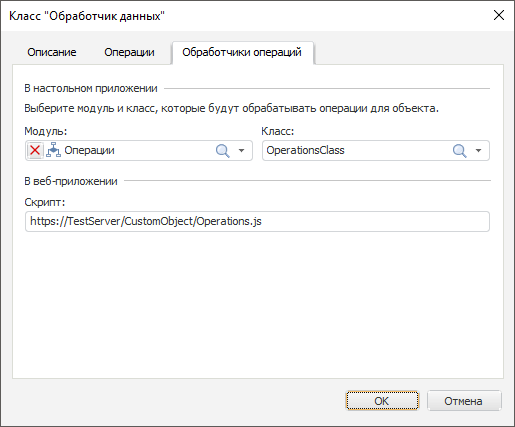 Для задания обработчика операций из веб-приложения в поле «Скрипт» укажите URL-адрес скрипта (js-файла или html-страницы, содержащей скрипт), реализующего операции, например, https://TestServer/CustomObjects/Index.html или https://TestServer/CustomObjects/Operations.js.
