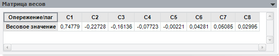 Панель содержит матрицу весов, используемую фильтром Бакстера-Кинга. В столбцах расположены рассчитанные значения коэффициентов. Размерность матрицы: 1×(q+1), где q - значение параметра «Опережение/лаг», заданного на панели «Спецификация» модели «Фильтр Бакстера-Кинга».