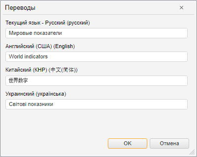 4. В открывшемся диалоге «Переводы» введите наименование объекта на доступных языках: