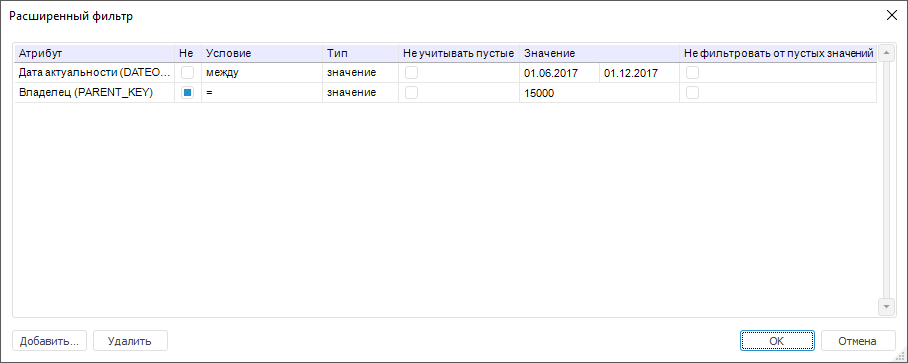 В результате будет добавлено условие фильтрации элементов измерения по значениям атрибутов измерения. Для удаления выбранного условия нажмите кнопку «Удалить».