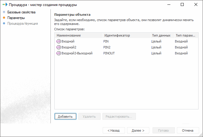 Для запуска созданной процедуры выполните команду контекстного меню «Открыть». После чего будет открыто окно задания параметров:
